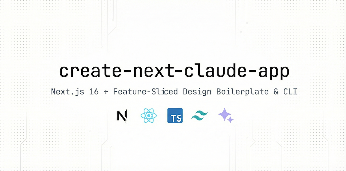 npx create-next-claude-app my-app 한 줄로 Next.js 16 + FSD 아키텍처 보일러플레이트를 즉시 생성합니다. Zustand, TanStack Query, React Hook Form + Zod, NextAuth.js 등 실무에서 검증된 스택이 기본 세팅됩니다.