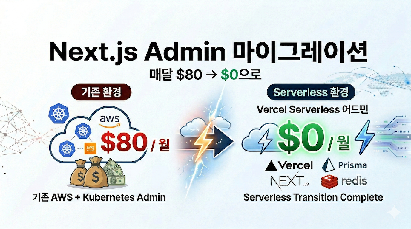 팀원 이탈로 EKS 인프라 유지보수 한계에 직면하여, Vercel 개인 플랜으로 Next.js 기반 모놀리식 Admin으로 마이그레이션. 배포, DB, Redis까지 Serverless 환경으로 전환하여 매달 서버 유지 비용을 $80 → $0으로 절감했습니다.