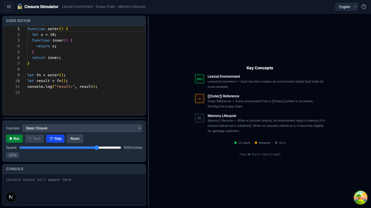 클로저가 캡처하는 환경 객체의 생성(Active) → 유지(Retained) → 해제(Collected) 생명주기를 힙 메모리 관점에서 시각화합니다. Scope Chain과 Closure Reference를 추적하여 GC가 어떤 환경을 수거하는지 직관적으로 보여줍니다.