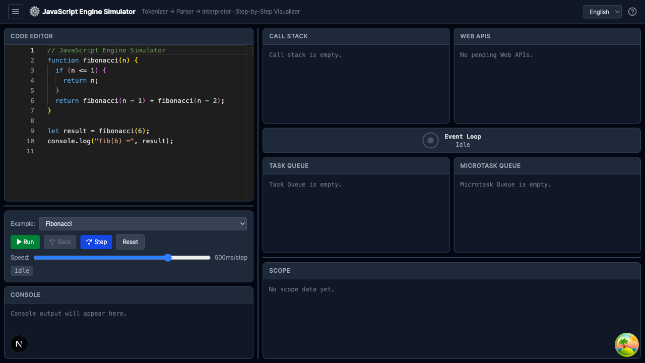 순수 TypeScript로 구현한 Tokenizer → Parser → Generator 기반 Interpreter 파이프라인으로 JavaScript 코드의 토큰, AST, Call Stack, Scope Chain을 단계별로 시각화합니다. Async 모드에서는 Web APIs, Task Queue, Microtask Queue, Event Loop까지 완전한 비동기 런타임을 시뮬레이션합니다.