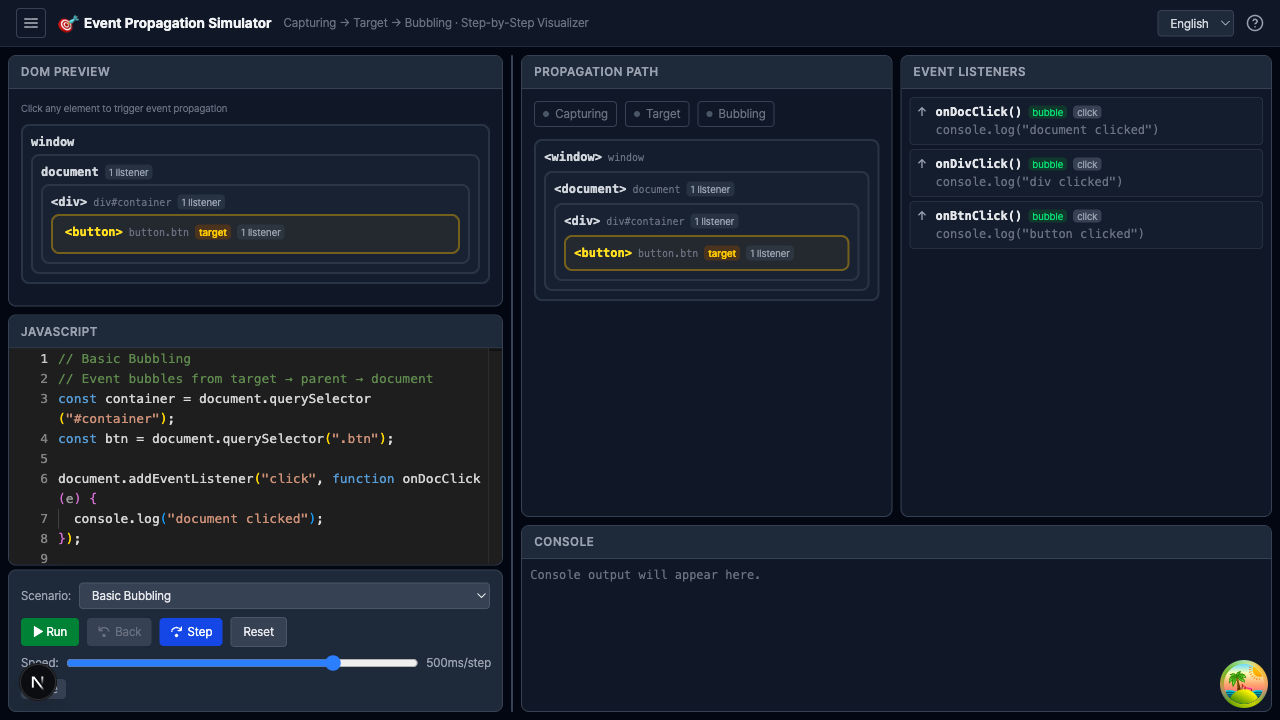 인터랙티브 DOM 트리 빌더로 노드를 구성하고, 이벤트가 Capturing → Target → Bubbling 단계를 거쳐 전파되는 과정을 애니메이션으로 시각화합니다. 이벤트 리스너 등록과 트리거를 동적으로 관리할 수 있습니다.