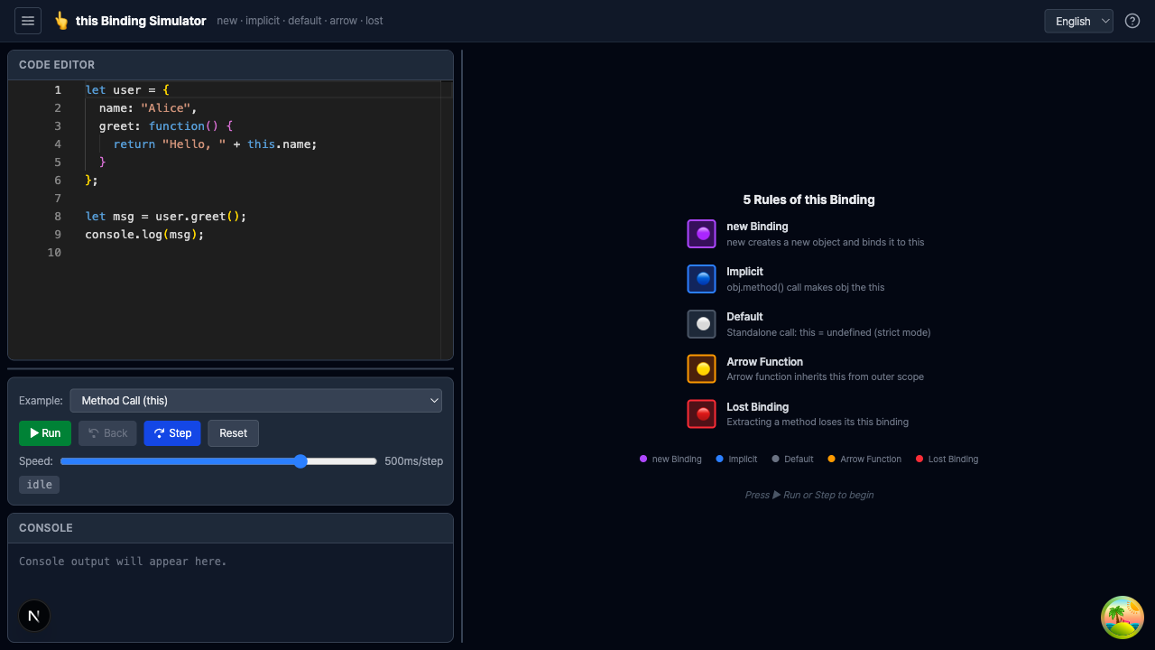 new · implicit · default · arrow · lost 5가지 this 바인딩 규칙을 실시간으로 감지하고 소스코드에 색상 코딩으로 표시합니다. 각 함수 호출 시점에서 this가 어떤 규칙으로 결정되는지 단계별로 확인할 수 있습니다.