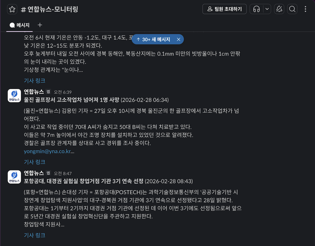 AWS Lambda + EventBridge로 연합뉴스 헤드라인을 스케줄링 기반으로 자동 수집하고, Slack API를 통해 지정 채널에 실시간 전송하는 Bot을 개발했습니다. 별도 서버 운영 없이 Serverless 아키텍처로 안정적으로 운영됩니다.